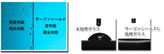 サーファシールドG塗布面は親水性をもたらされ、水滴はガラス表面に留まることが出来ないため、水は表面をすべり、埃や汚れの下に潜り込むように下へ流れていきます。