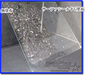 雨季に4ヶ月間外にさらしたガラスパネルです。砂や埃などによる汚れがそのままの無塗布パネルに対し、サーファシールドG塗布パネルは汚れが落ちています。